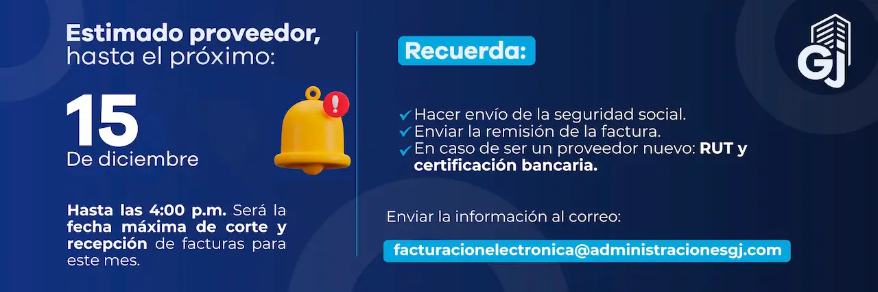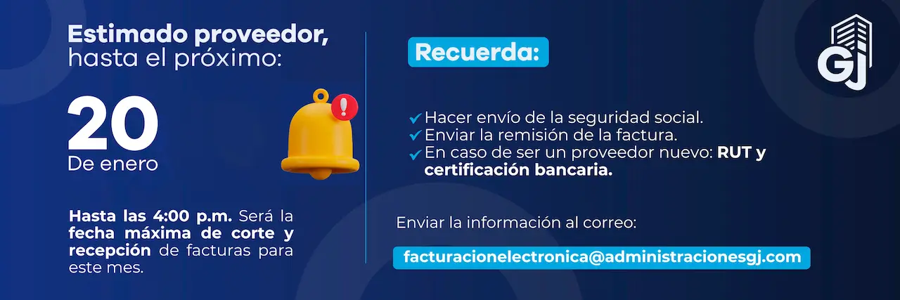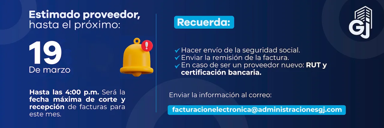Recuerda que debes enviar factura o cuenta de cobro con el nombre del edificio, junto al RUT, la certificación bancaria y planilla de seguridad social al correo: